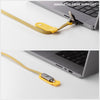 inCharge® XL 3m / 10ft - 100W, 6in1 ultra long cable - Urban Black - Hand pulling durable reinforced mustard yellow charging cable and extended long cable on desk next to laptop. - Rolling Square